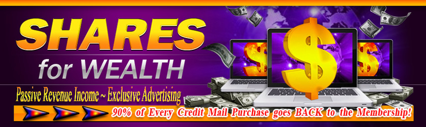 Shares for Wealth is an Advertising Site where Members Earn Credits for Clicking Credit Mailers & Banner Ads. An Advertising Share Costs just $10.00 and you receive 2 Credit Mails to the Entire Membership and 2 - 468 Banner Ads w/2000 imps. You also then receive a FREE Advertising Revenue Share Position! You receive one FREE Advertising Revenue Share Position EVERYTIME you Purchase an Advertising Share! Every time someone buys that Advertising Share, that purchase will pay out to 30 Advertising Revenue Share Positions & a 30% Referral Bonus is Paid through 3 Levels. Members Earn Credits for Viewing YOUR Credit Mailer and Banner Ads...they can then trade those earned credits for even more Advertising!